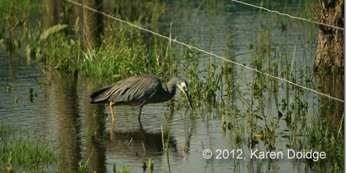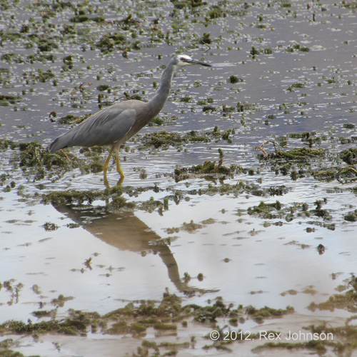 A heron is seen here on the margin of Lake Dunstan feeding in the weed beds. The lake level had been allowed to drop about 1m as a part of a program of weed control, so there was more than normal exposed weed at this time (Jan - Feb 2012).